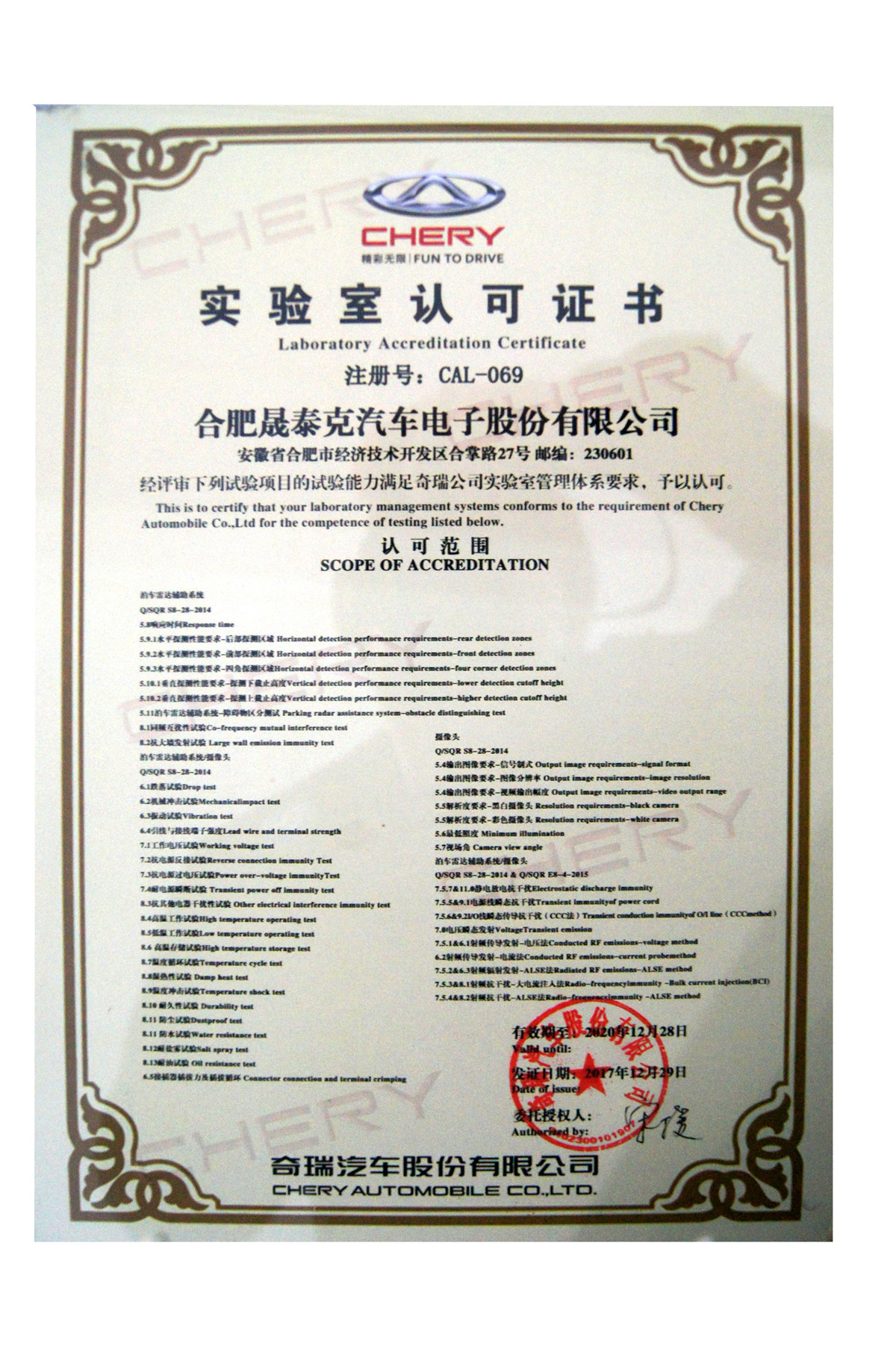 實(shí)驗(yàn)室認(rèn)可證書 奇瑞汽車股份有限公司