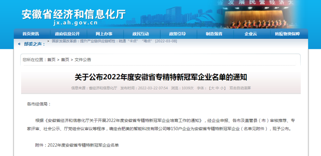 日前,安徽省經(jīng)信廳發(fā)布了《關(guān)于公布2022年度安徽省專精特新冠軍企業(yè)名單的通知》,我司憑借雄厚的技術(shù)實(shí)力和創(chuàng)新能力成功入選該名單。