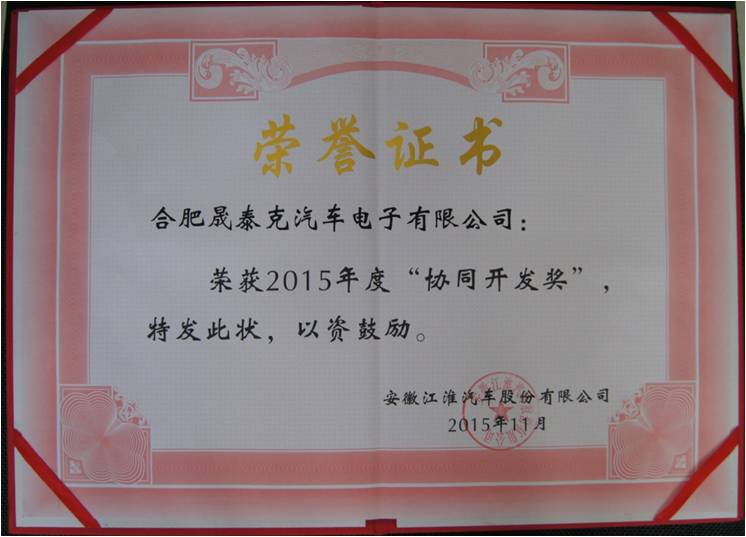 2015年 獲得江淮協(xié)同開發(fā)獎獎狀