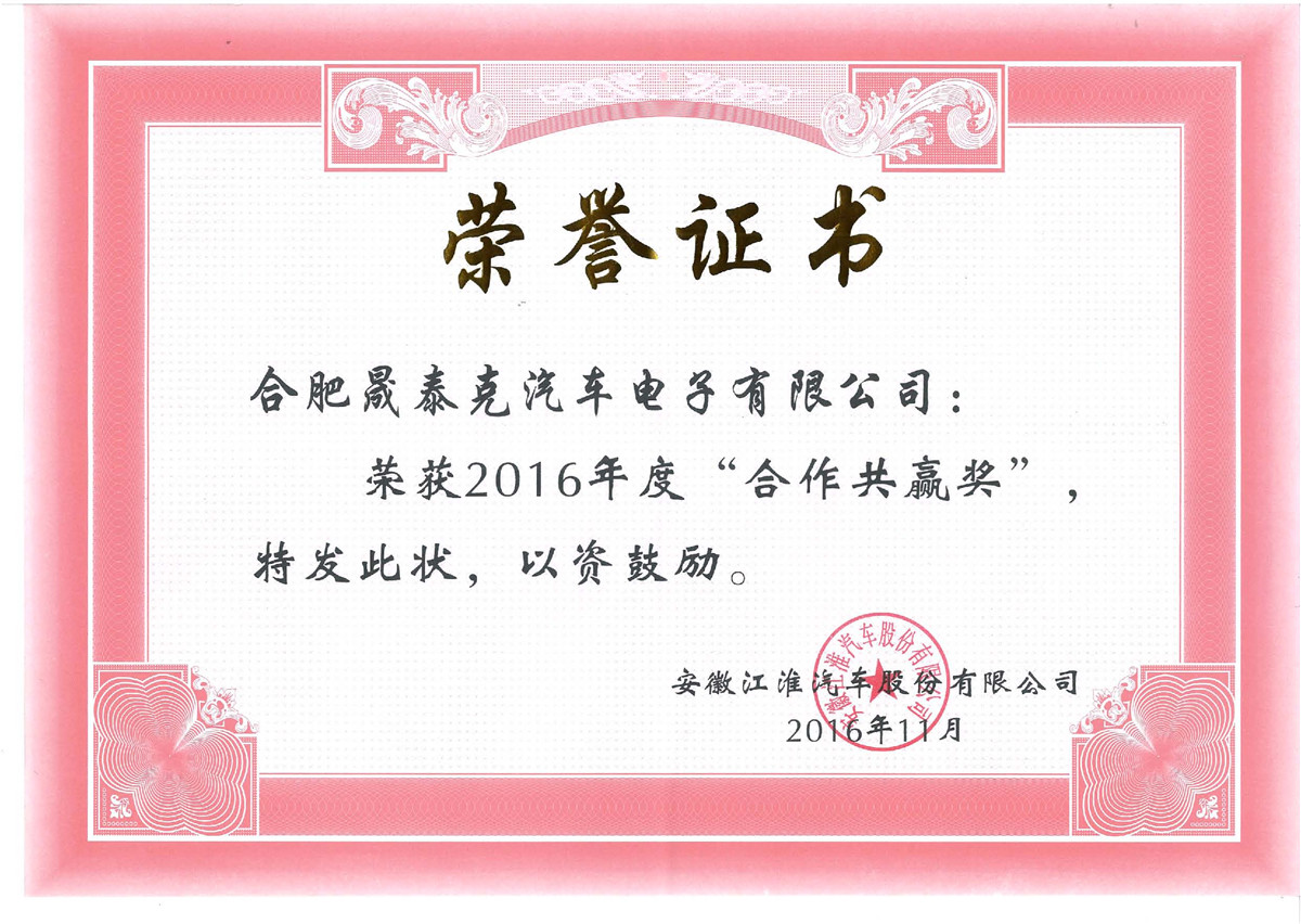 2015年獲得江淮合作共贏獎獎狀