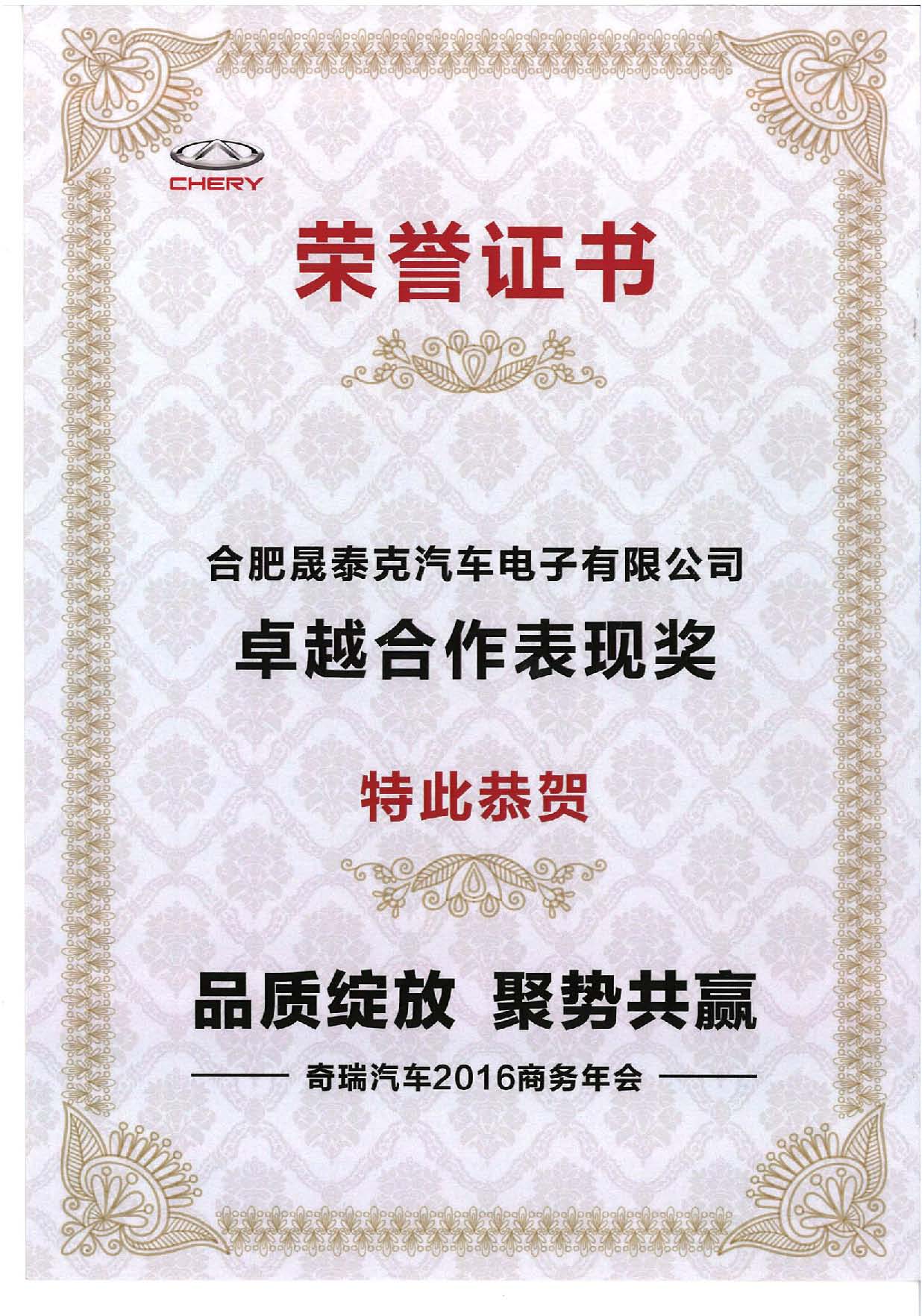 2016年 奇瑞卓越合作表現(xiàn)獎