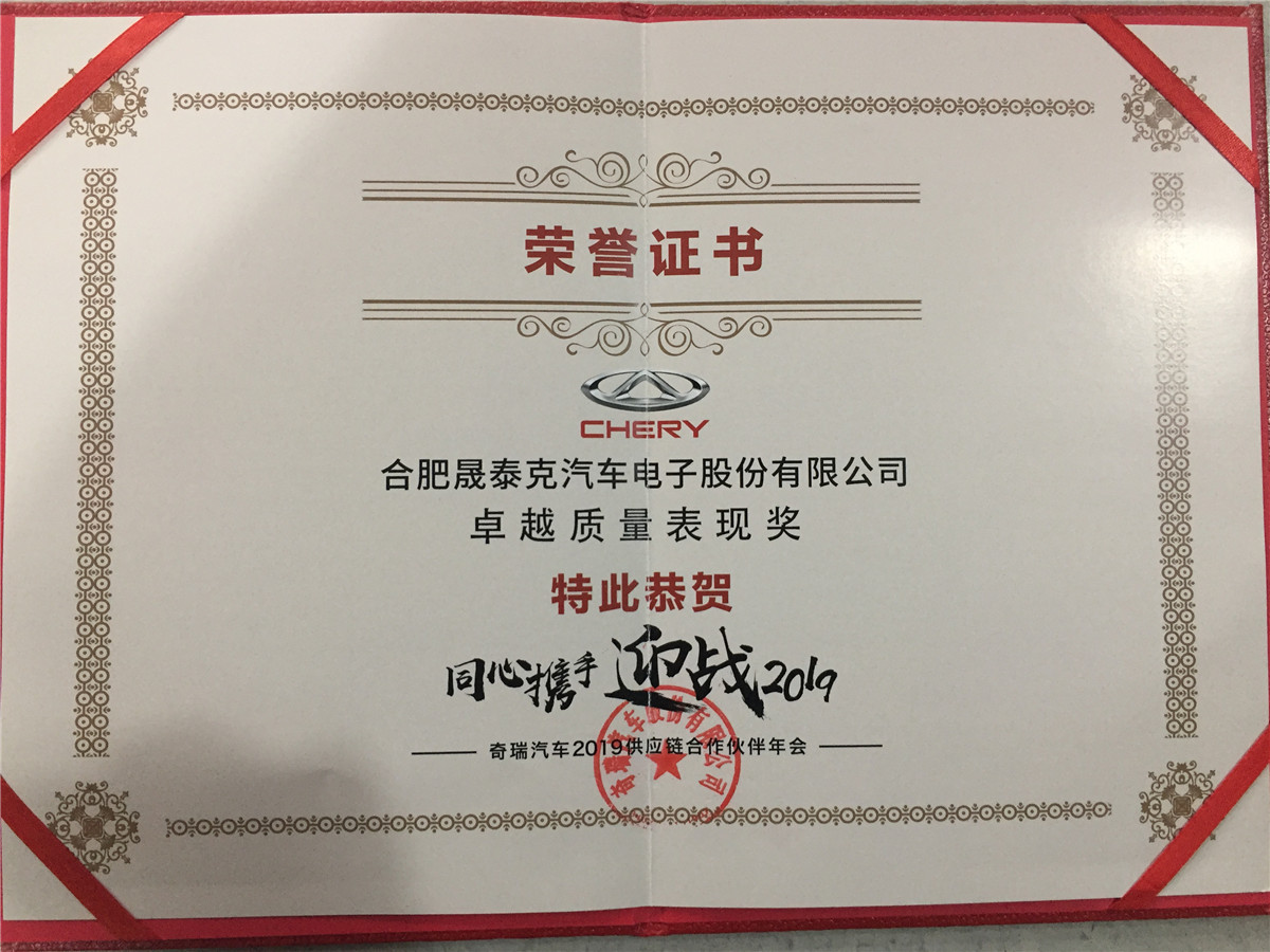 奇瑞汽車卓越質(zhì)量表現(xiàn)獎 -證書
