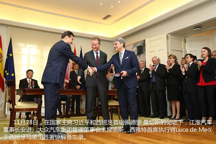 11 月 28 日,在國家主席習(xí)近平和西班牙首相佩德羅·桑切斯的見證下,安徽江淮汽車集團股份有限公司(以下簡稱“江淮汽車”)與大眾汽車集團(中國)、西雅特簽署諒解備忘錄。