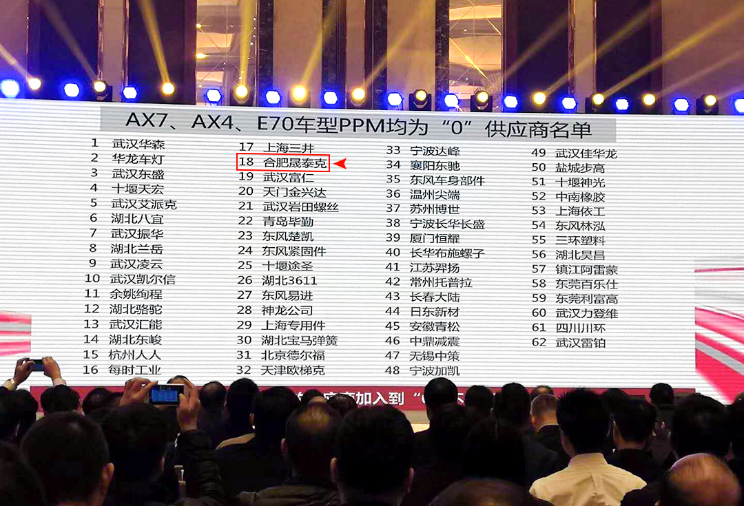 2018年12月21日,在東風(fēng)乘用車公司供應(yīng)商年會上,晟泰克在質(zhì)量業(yè)績上取得0PPM的驕人成績,受到東風(fēng)公司的通報(bào)表揚(yáng)。再次驗(yàn)證,晟泰克具備先進(jìn)的研發(fā)體系和完善的質(zhì)量保證能力,持續(xù)鑄就質(zhì)量品牌,與客戶實(shí)現(xiàn)雙贏。FOR CAR FOR WORLD。